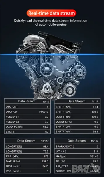 - OBD2 скенер с възможности за проследяване данни на живо, графики и стоп кадри. Графиките на живо и данните от сензорите на автомобила позволяват да се установят ефективно всякакви аномалии и тенденции.