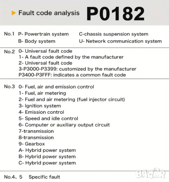 Диагностициране на кодове за неизправности и показване дефинициите на кодовете.