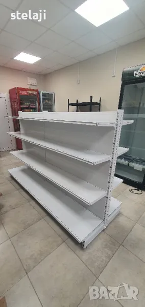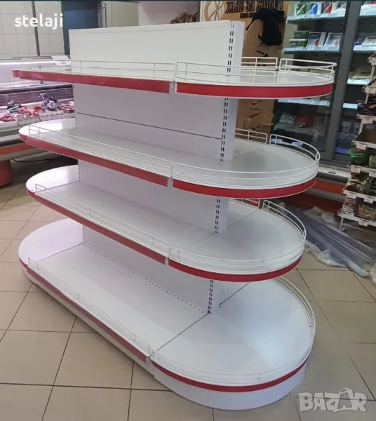 Островните стелажи могат да бъдат със заоблени рафтове за по - хубава видимост на подредената стока.