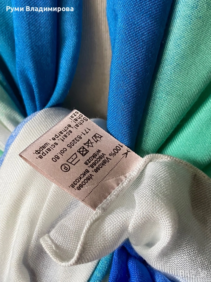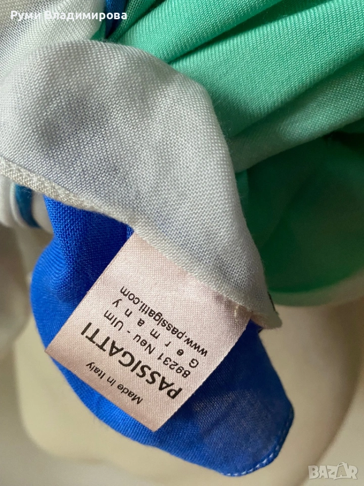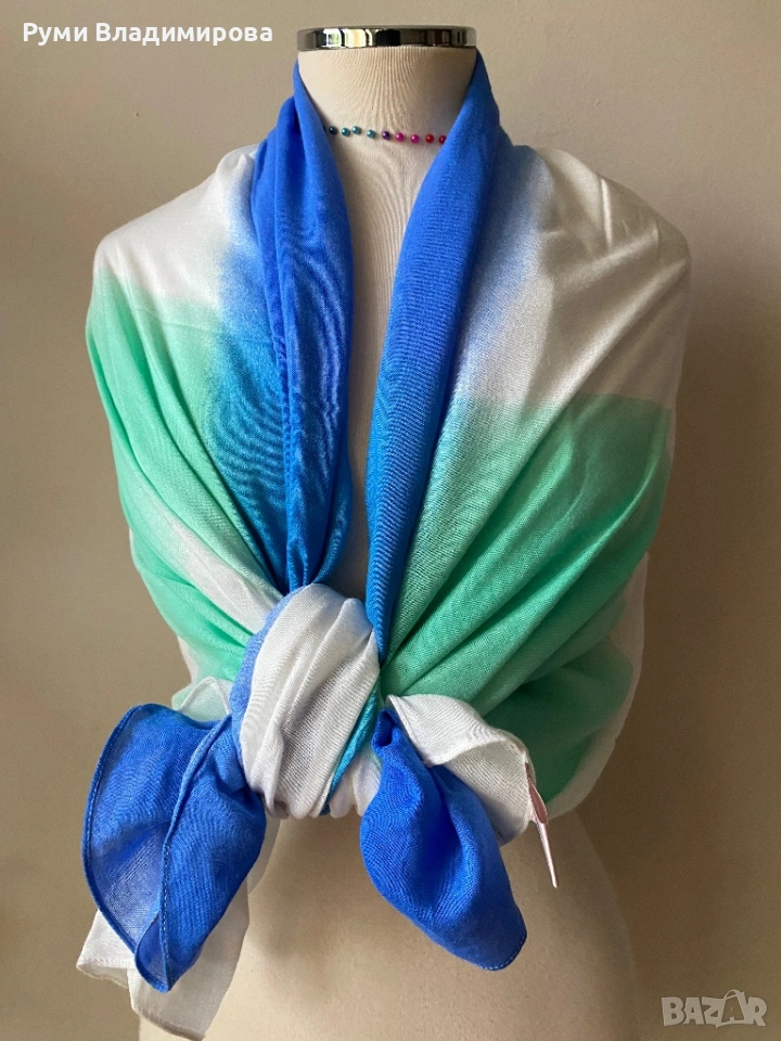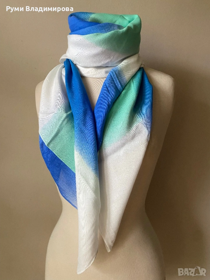 Бял шал със свелозелено и светлосиньо, голям квадрат с размер 133,5 Х 133,5 см, от 100 % вискоза Passagati, нов. Доставка с Еконт!