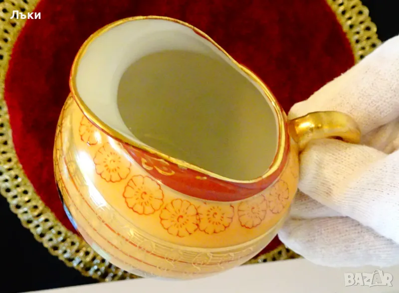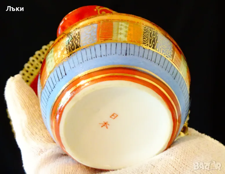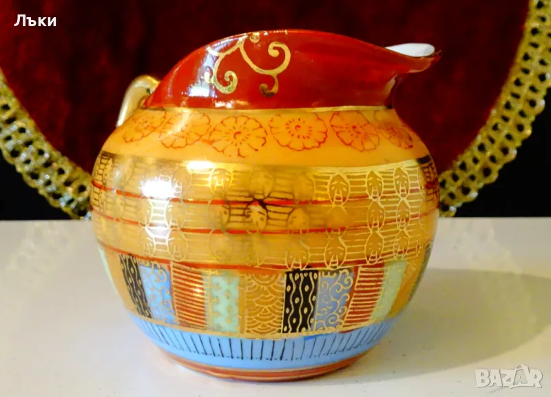 ръчно рисувана в стил Ku Tani „Хиляда лица” с много злато 22 карата.Маркирана,датира от 1926 година.Височина 7 см.,диаметър 8 см.,дължина 10.5 см.Вместимост 180 мл.Перфектна.