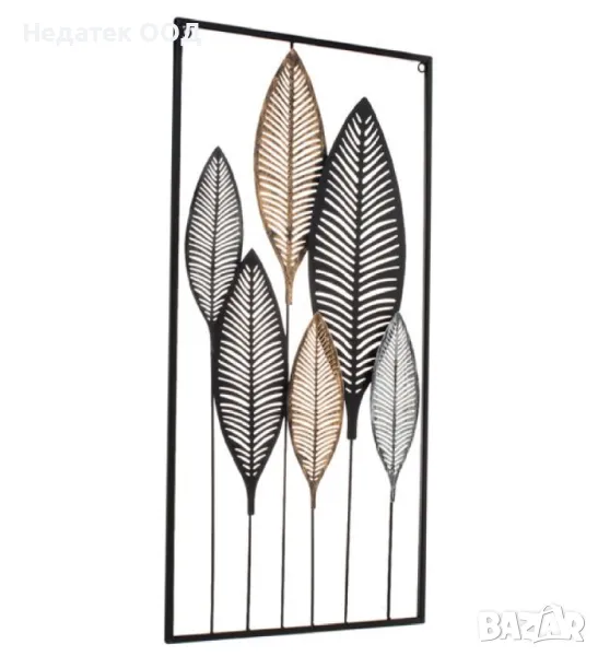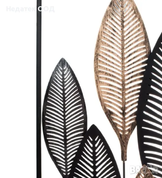 Стенна метална рамка с перфорирани листа в черно, сребристо и бронз, в черна рамка. Монтира се с 2 метални опори от задната страна. Пасва както на цветни, така и на бели стени и придава модерна нотка на вашата декорация.