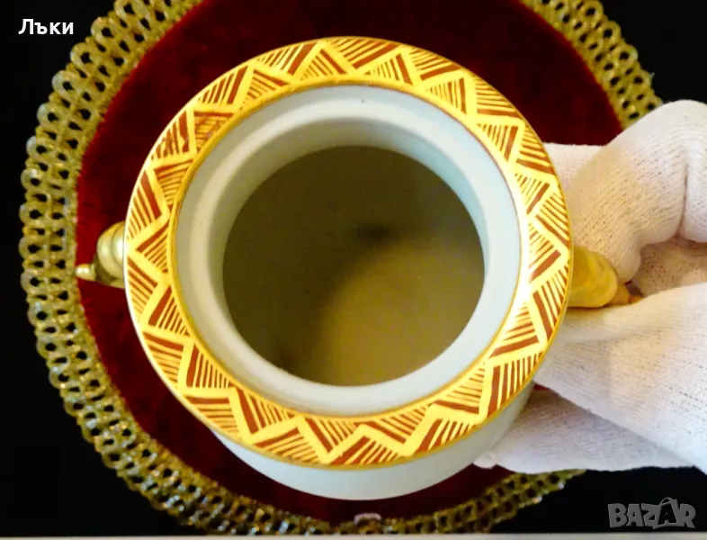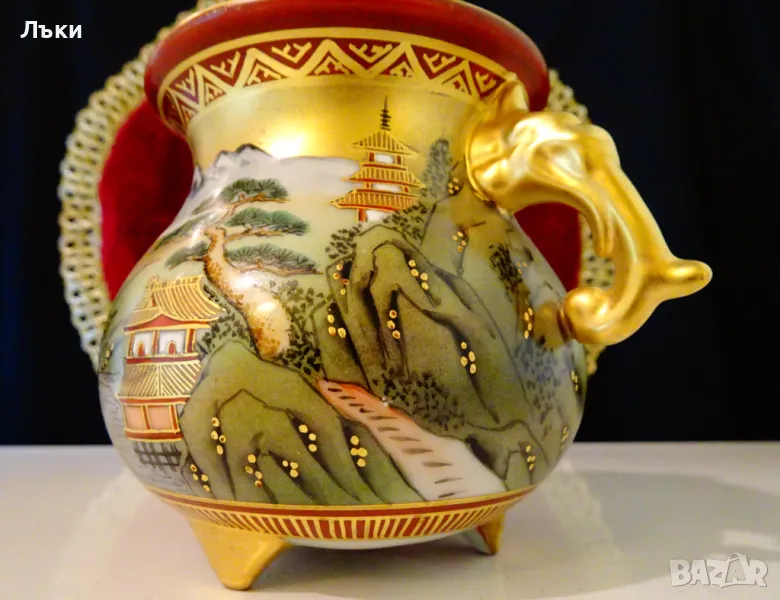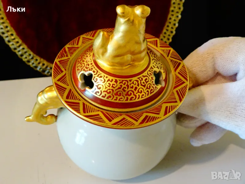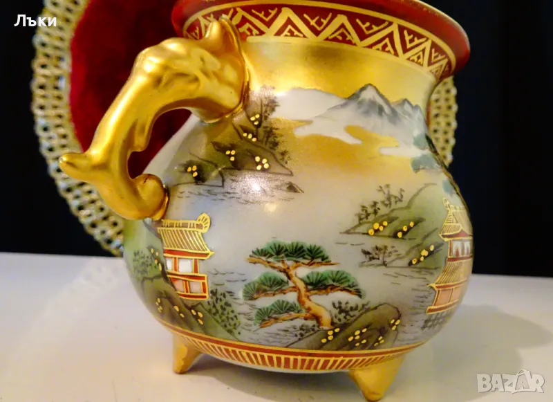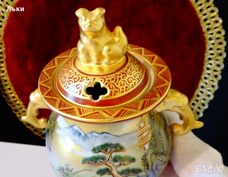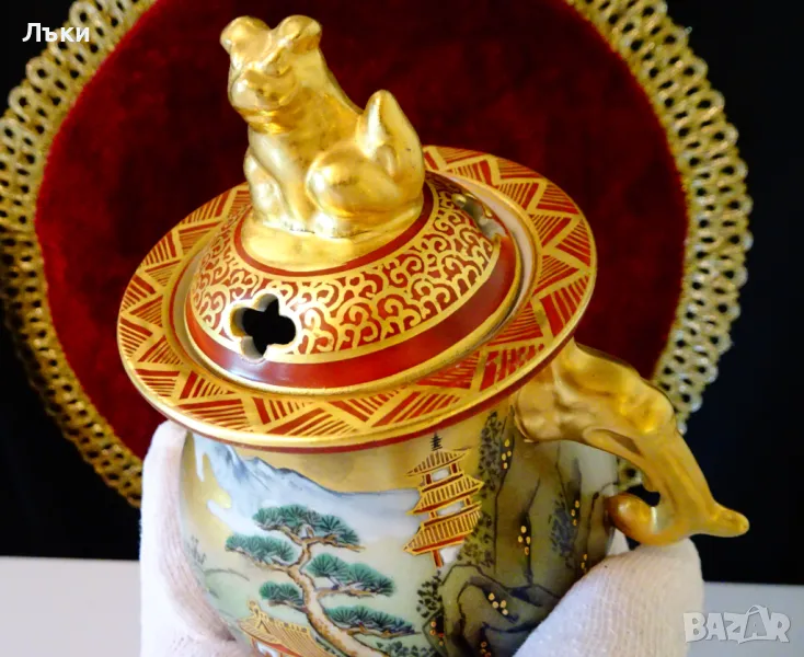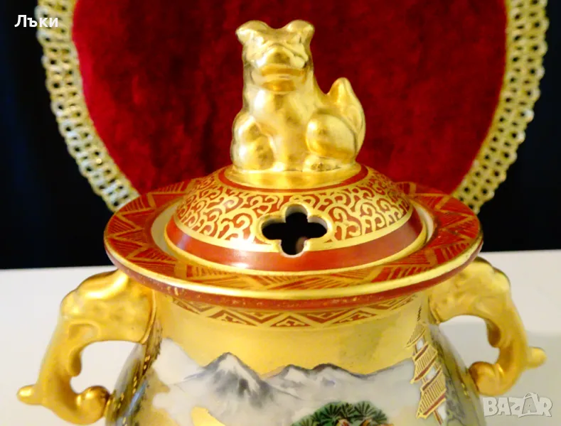 – 1880 година,период Meiji.Изделията Kutani са произвеждани в градовете Канадзава,Комацу,Кага и Номи в южната префектура Ишикава.Те се характеризират със своите ярко оцветени надглазурни емайли,наречени Gosai-te,известни като „Kutani Gosai“.Великолепен съд тежък порцелан,ръчно рисуван с живописна природна картина,която разкрива красотата на Ишикава.Има две дръжки релефна скулптура - глава на слон.Върху капачето гордо стои фигура на храмов лъв.Всичко грее в блясъка на ръчно рисувано злато 24 карата.Височина 13.5 см.,диаметър 9 см.,дължина с дръжките 13 см.Тегло 325 гр.