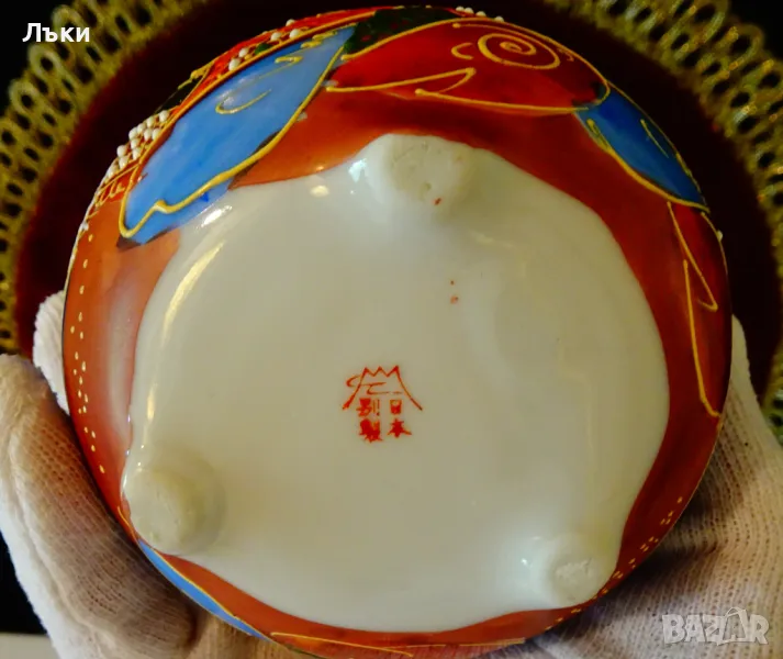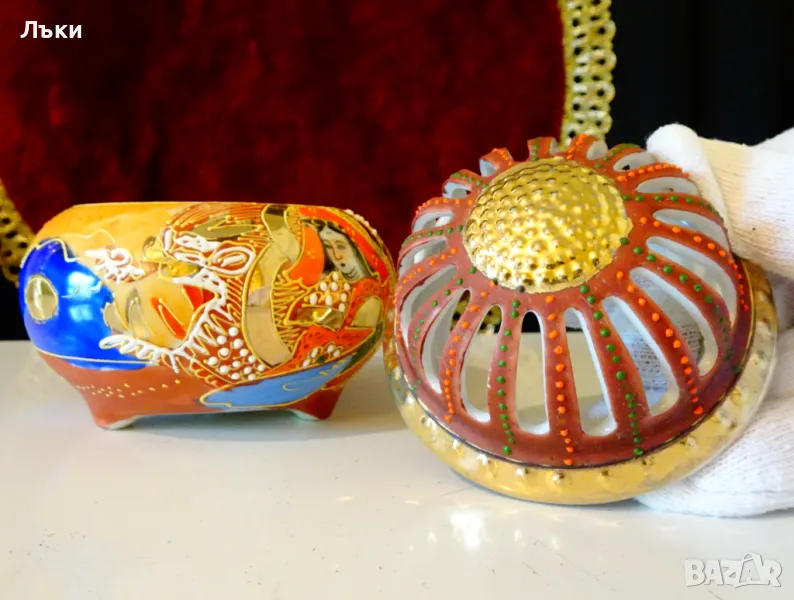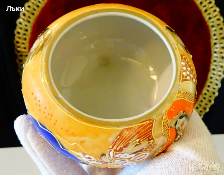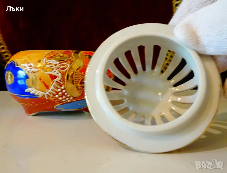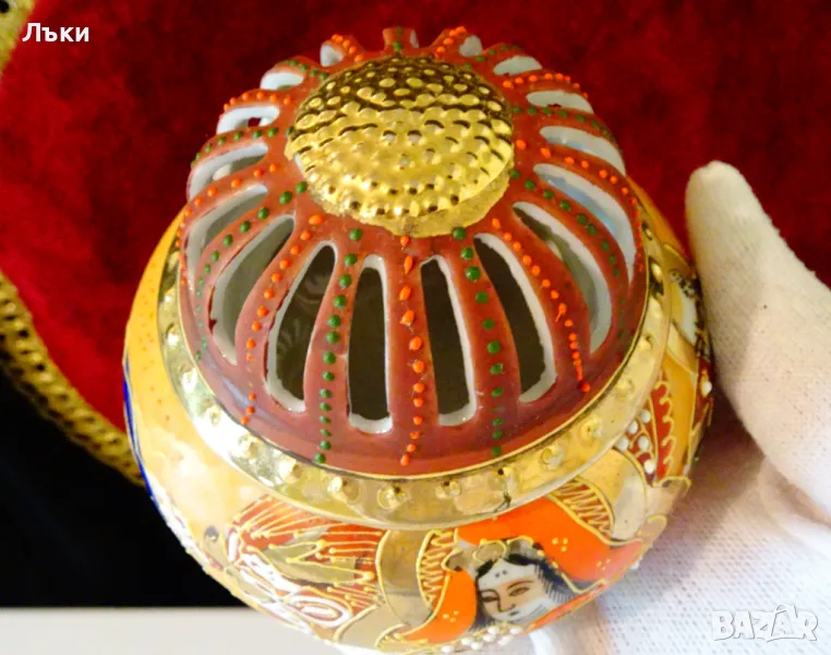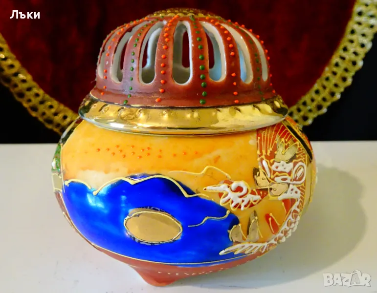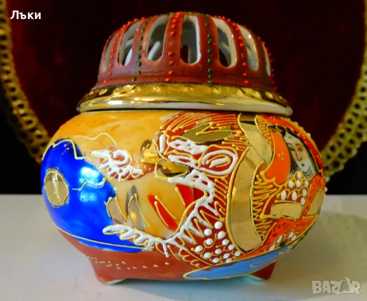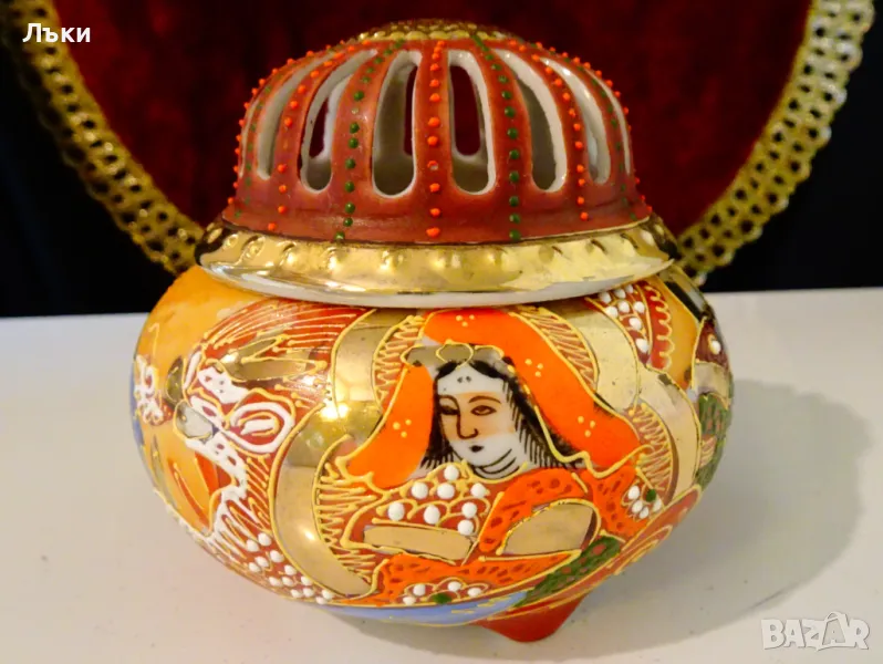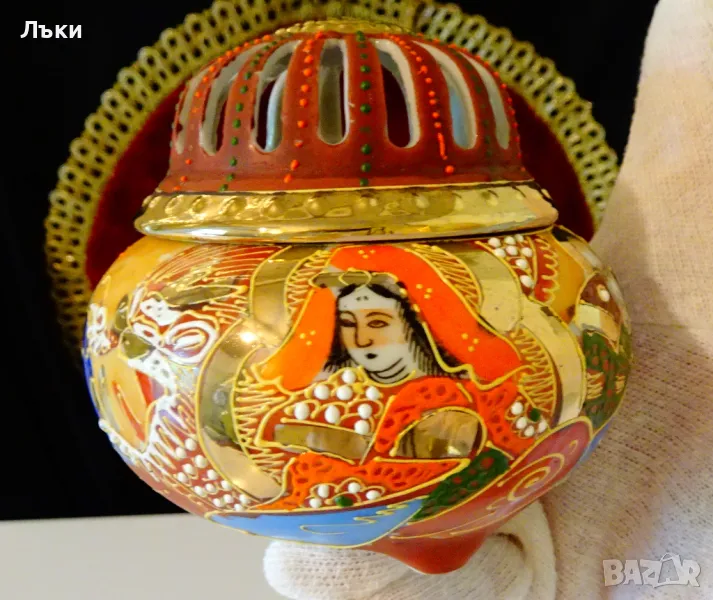 Старинен японски съд Koro,тамянник,кандило,кадило,кадилница,японски костен порцелан,ръчно рисуван в стил Сацума с изпъкнали цветни емайли Moriage и 24 карата злато.Изобразена е богинята
