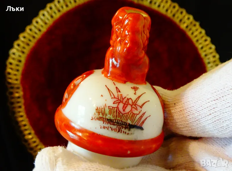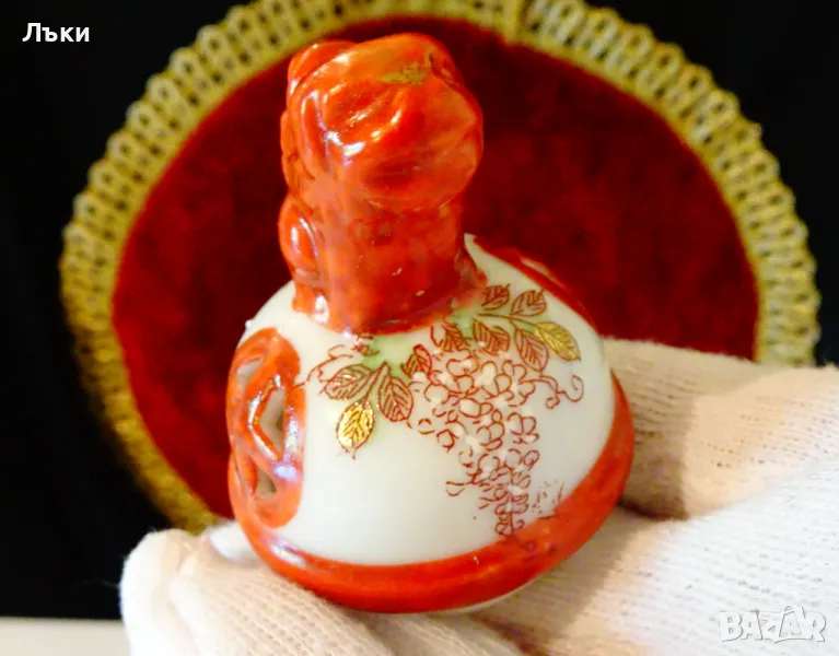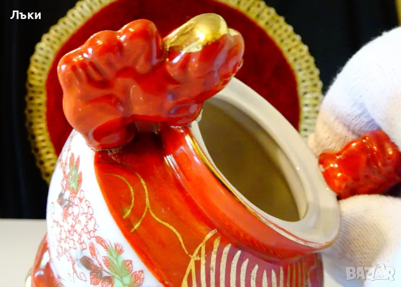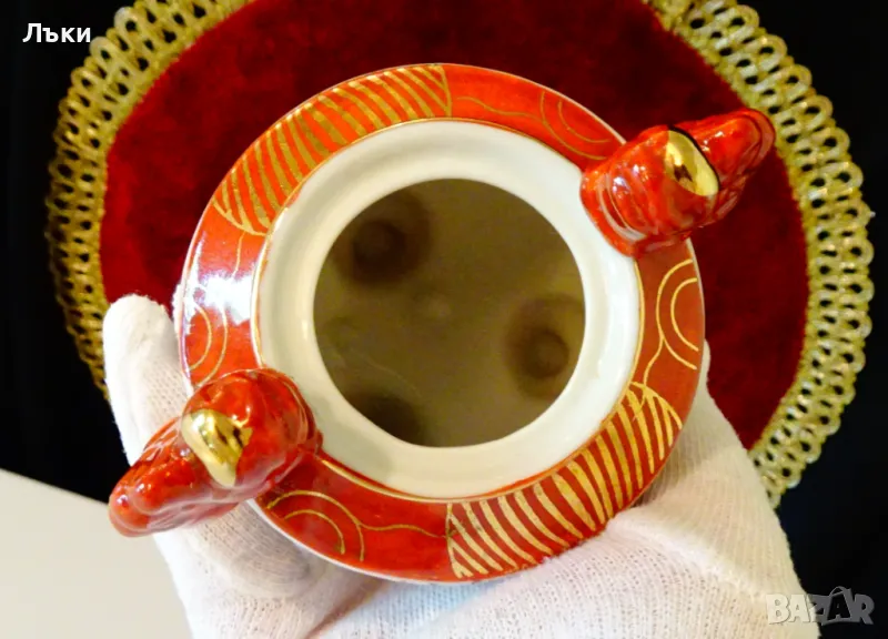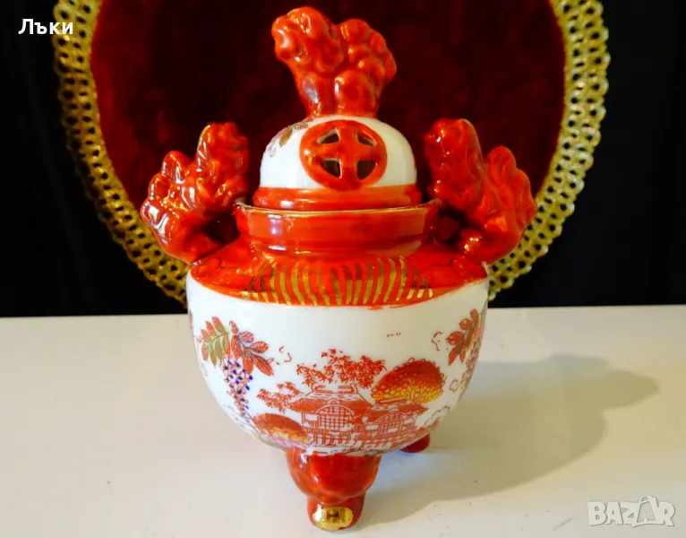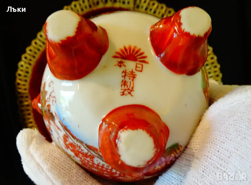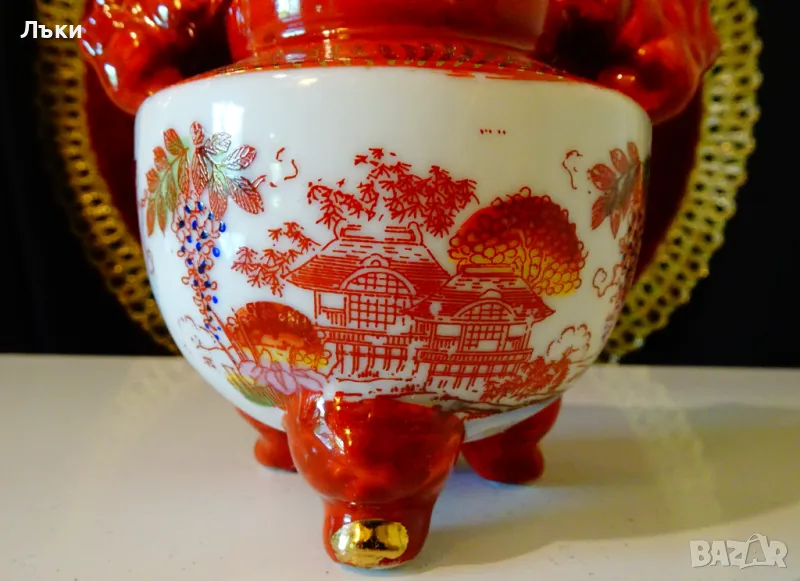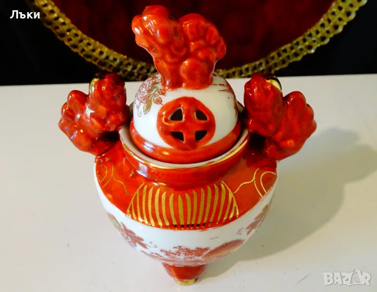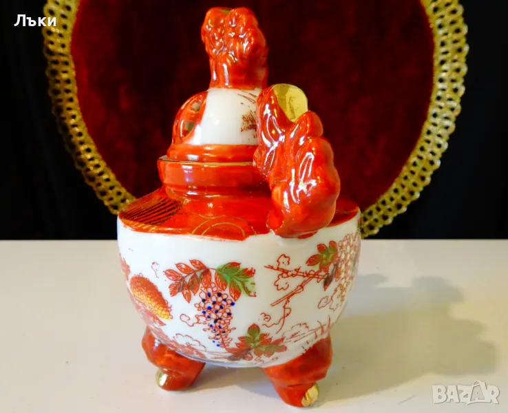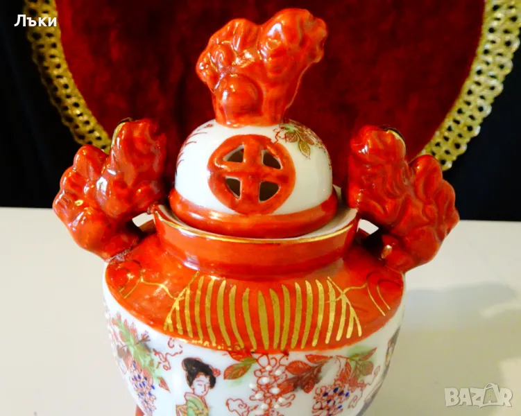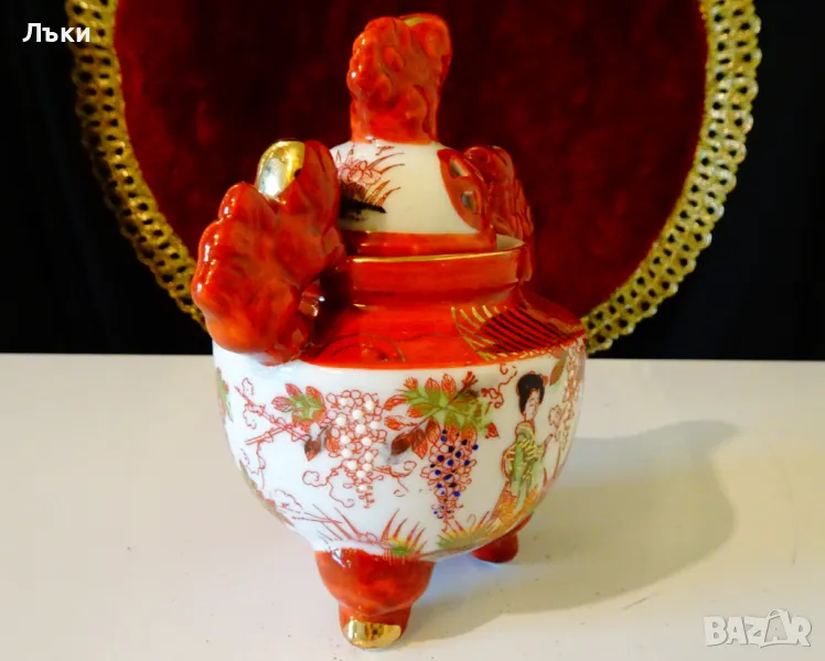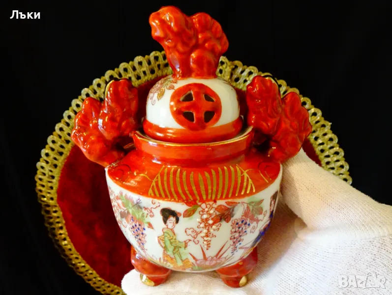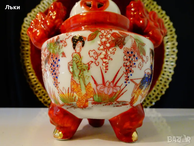 Старинен японски съд Koro,тамянник,кандило,кадило,кадилница,японски порцелан,ръчно рисуван в стил Сацума с изпъкнали цветни емайли Moriage и 24 карата злато.Изобразени са гейши в градините на императорския дворец.На капачето е фамилният герб на клана Шимазу,управлявал Satsuma Han.Дръжките са релефни фигури на японски храмов лъв.Кадилницата е маркирана - Специално произведено в Япония,датира от 1930 г.Височина 12 см.,диаметър 8 см.,дължина с дръжките 11