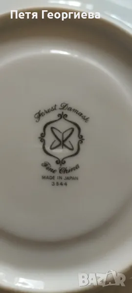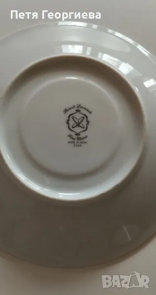 Нов японски сервиз от фин порцелан за дълго кафе или чай. Бяла чаша със сребърни кантове. Чинийка на бели цветя върху маслено зелена основа и сребърни кантове. Печат, модел Forest Damask. 5 двойни сета или целият сервиз за 78.23 лв., 40 €