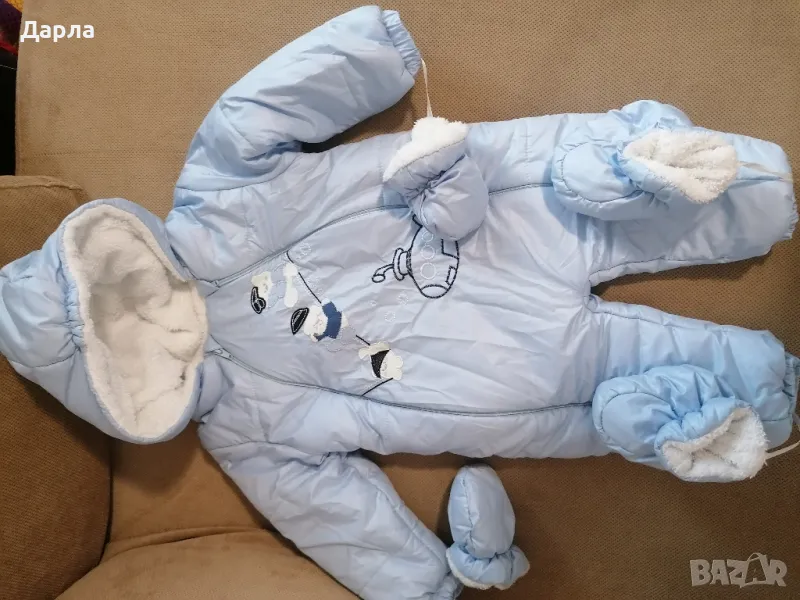 Светло син, ватиран космонавт с ръкавици, качулка и буйки. Размер 86