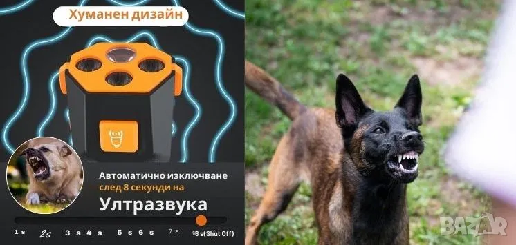 Dog Trainer изключва автоматично излъчването на ултразвук след 8 секунди като защита от неправилна употреба.