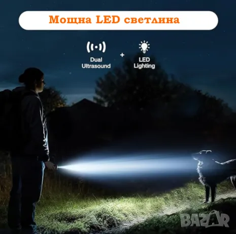 Светлинният LED източник осигурява осветление за разходка или мигаща аварийна светлина за през нощта. Мигащата светлина, съчетана с ултразвук, усилва ефекта при трениране или отблъскване на кучета.