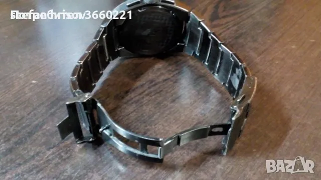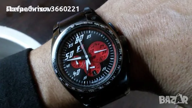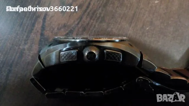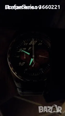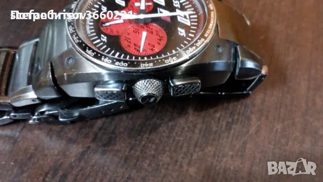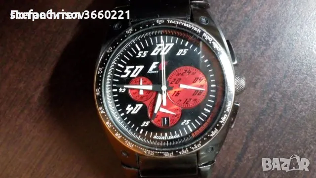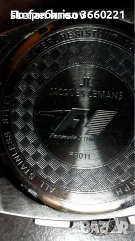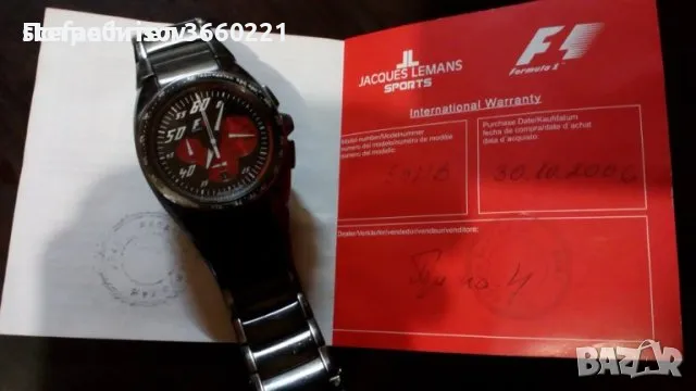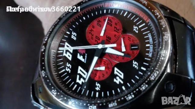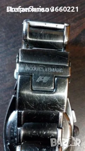 леки следи от употреба.прецизно работи всичко по него.сменена батерия.Sport FORMULA 1 кварцов хронограф от швейцарската часовникарска компания Jacques Farel, с черен анодизиран корпус и верижка от неръждаема стомана и официалното лого на F1, изписано на часовника.Кварцов хронограф.Часовник Jacques Lemans