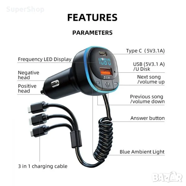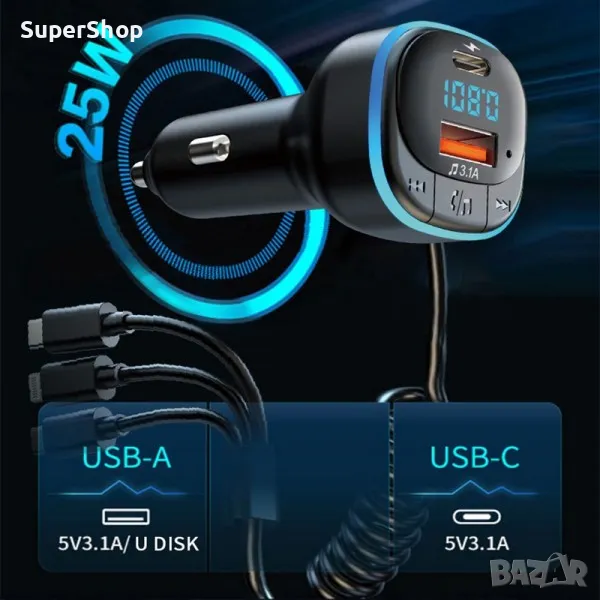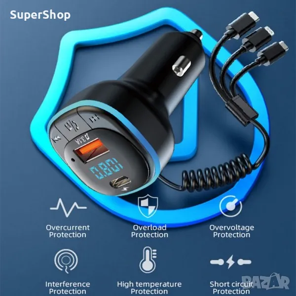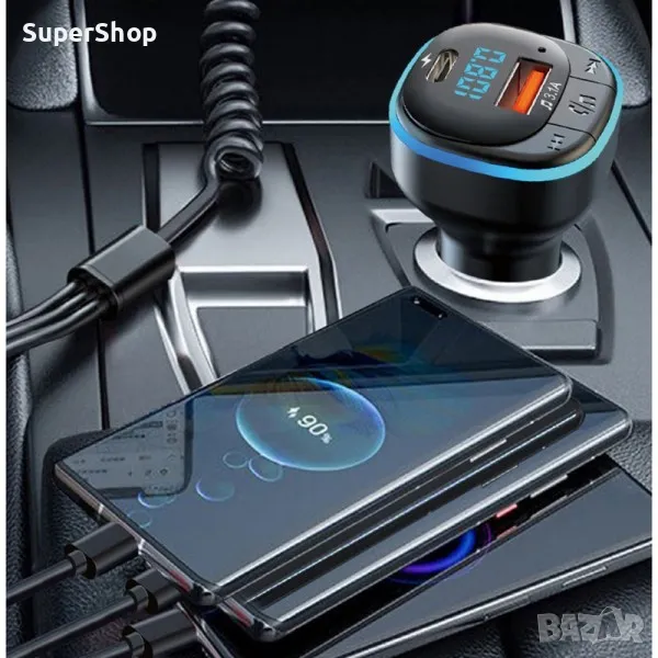 ФМ Трансмитер с бързо зарядно и кабели за кола – Type-C, MicroUSB и Lightning – iPhone. Подходящ за слушане на музика и провеждане на разговори с включено бързо зареждащо зарядно с три броя кабели за зареждане на няколко устройства едновременно + два допълнителни порта.