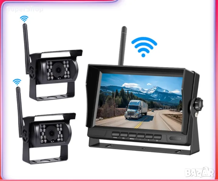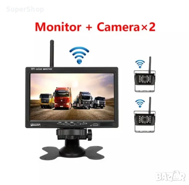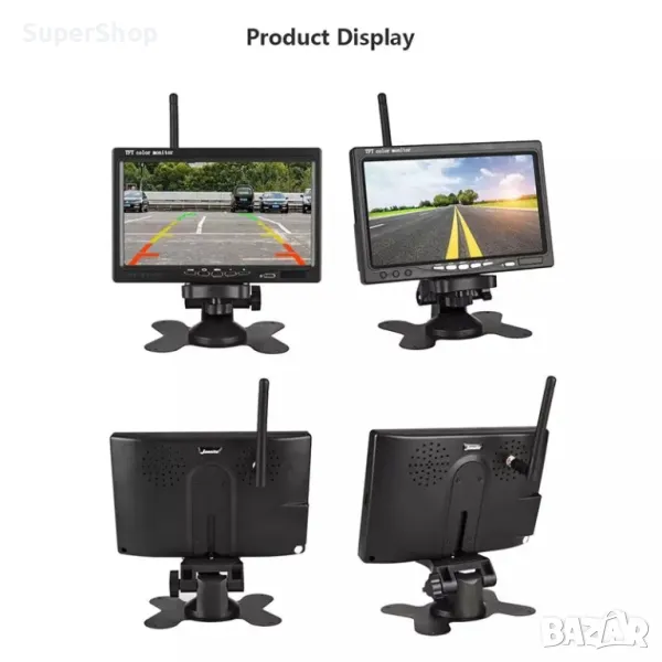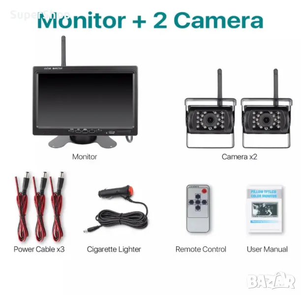 Безжичната система за видеонаблюдение на превозни средства се състои от монитор с 7″ дисплей и две камери с висока разделителна способност и безжична връзка към монитора. Аксесоарите включват антена, захранващ кабел, стойка за монитора, винтове и дистанционно управление. Мониторът и камерата могат да бъдат свързани към захранването на автомобила отделно, инсталация е лесна.