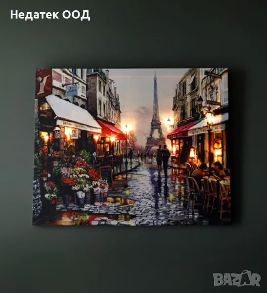 Декоративно платно с вътрешно осветление и скица, изобразяваща парижка улица с кафенета и магазини за цветя и Айфеловата кула на заден план. Има 10 светодиода и работи с 2 батерии АА (не са включени).