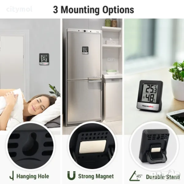 Позволява на потребителя да монтира устройството върху метална повърхност, напр. хладилник или просто да го поставете на масата