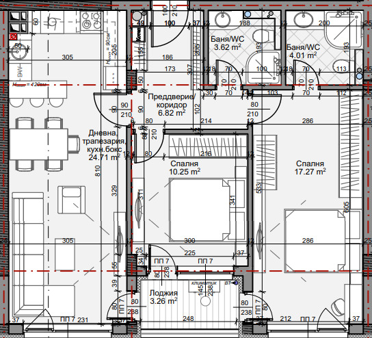 Състои се от: антре (6,82 кв.м), дневна с кухненски бокс (24,71 кв.м), спалня (17,27 кв.м), втора спалня (10,25 кв.м), баня с тоалетна (3,62 кв.м), втора баня с тоалетна (4,01 кв.м) и тераса лоджия (3,26 кв.м).