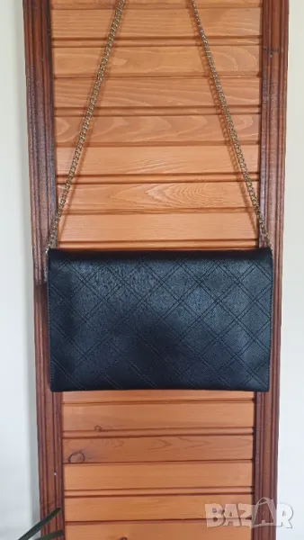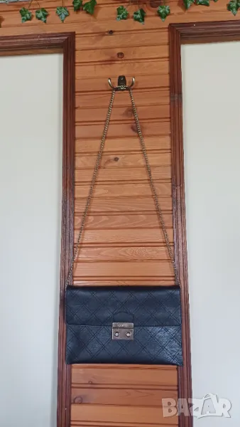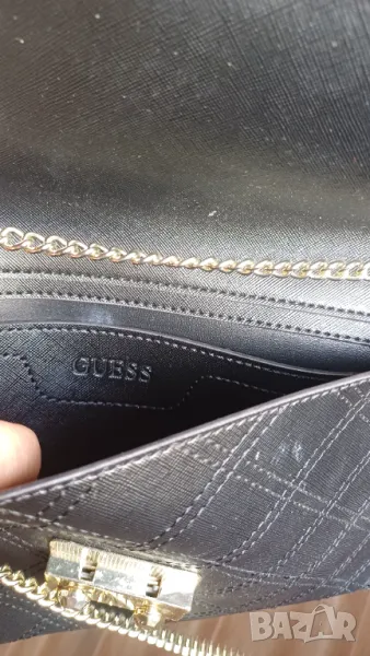Продавам оригинална елегантна дамска кожена черна чанта, марка Guess. Със златиста дръжка, има една преграда и едно джобче. Няма забележки.