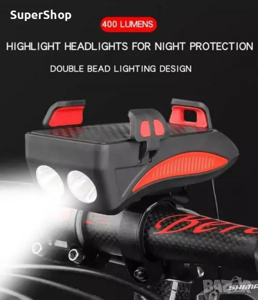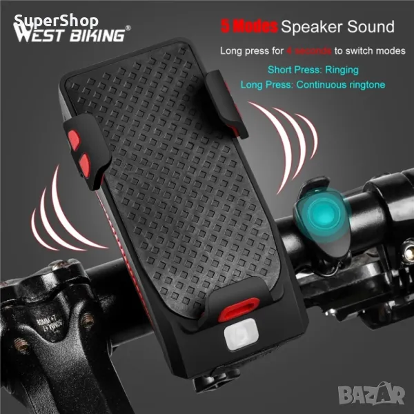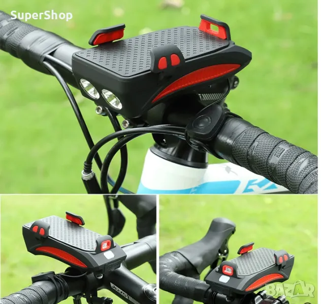 Уникална стойка за телефон на велосипед, скутер, електрическа тротинетка, мотор, колело и др. с мощен LED фенер, клаксон и поставка за телефон + POWERBANK / външна батерия.