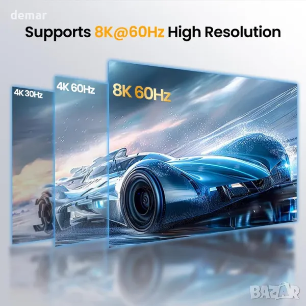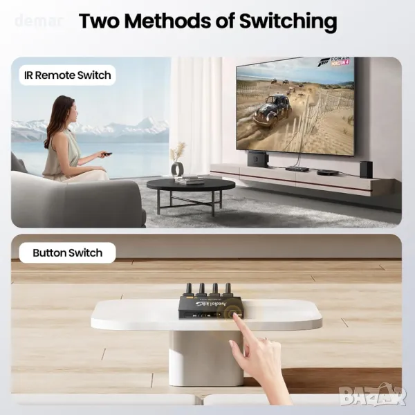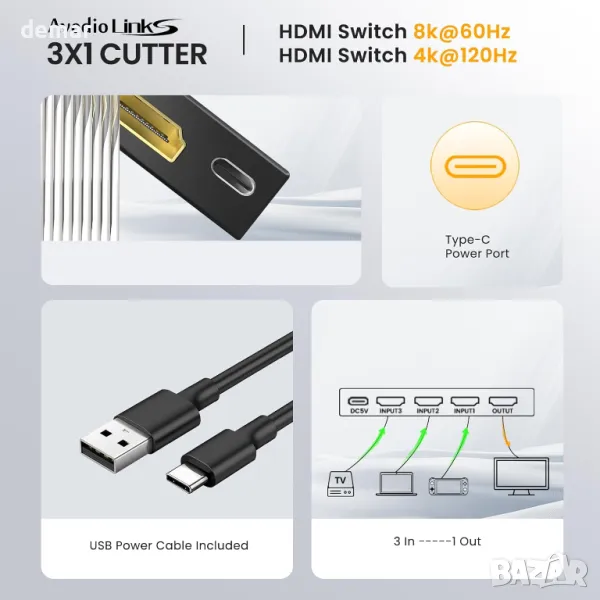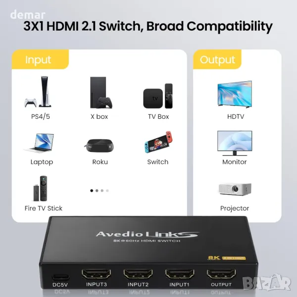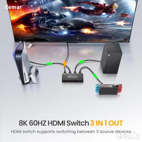 Този 8K HDMI превключвател свързва 3 HDMI източника към 1 дисплей, позволявайки безпроблемно превключване и намалявайки износването от постоянното включване на кабела. Той поддържа високи разделителни способности до 8K@60Hz, обратно е съвместим с HDCP2.3, HDMI 2.1/2.0/1.4 и предлага функции като HDR и Dolby Vision за първокласни аудиовизуални изображения. Широко съвместим с устройства като PS5, Xbox и Blu-ray плейъри, този plug-and-play превключвател осигурява гладка работа без допълнителна настройка. Пакетът включва дистанционно управление, USB кабел за зареждане и гарантира стабилно предаване на сигнала, което го прави идеален за използване в дома, офиса или игри.