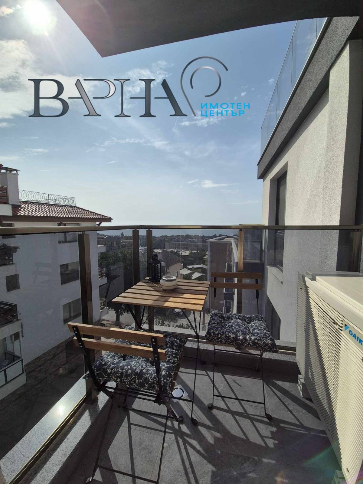 Жилището се намира на среден висок етаж и разпределението е следното: входно антре, голяма дневна с кухня, две спални, просторна баня с тоалетна, както и тераса с МОРСКА ПАНОРАМА! Имотът е изцяло обзаведен и оборудван с най-висок клас мебели и електроуреди! Отоплението и охлаждането е чрез три супер-енергоспестяващи климатици! Във всяка стая има поставен телевизор. В наемата цена са включено и ползването на двойно паркомясто!