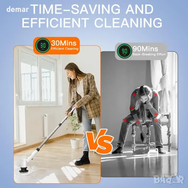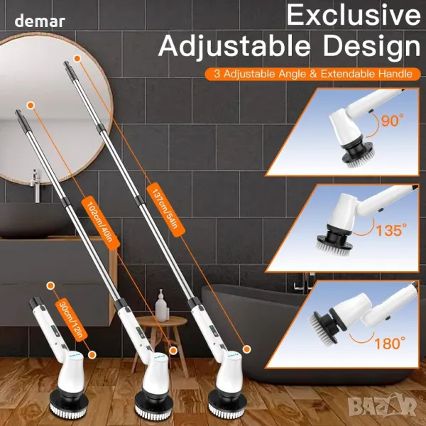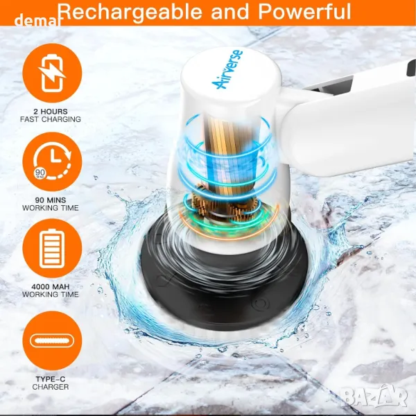 Airverse Electric Spin Scrubber е универсален почистващ инструмент със 7 различни глави на четки, предназначени за различни повърхности, включително подове, вани, печки и др. Разполага с 3 регулируеми размера на дръжката (12 инча, 40 инча, 54 инча) и 3 ъгъла на главата на четката (90°, 135°, 180°) за лесен достъп до труднодостъпни места без огъване. С двойни скорости (360RPM и 420RPM) и ефективно отстраняване на петна, той намалява времето за почистване с 50%. Безжичният дизайн, захранван от 4000MAH батерия, предлага до 90 минути почистване след 2-часово бързо зареждане. Водоустойчивата, лека и лесна за сглобяване конструкция IPX7 осигурява безпроблемно и безопасно почистване.