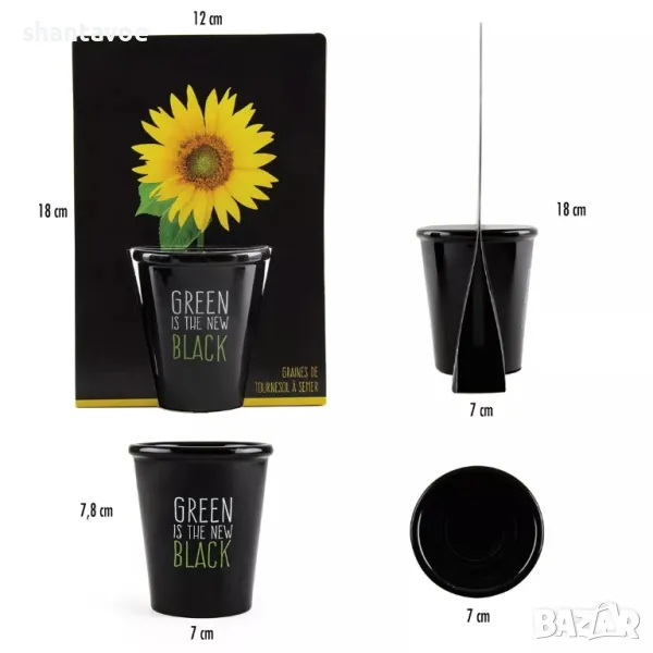 Сетът съдържа черна керамична саксийка, пакетче със слънчогледови семки и няколко таблетки дехидратирана кокосова пръст.