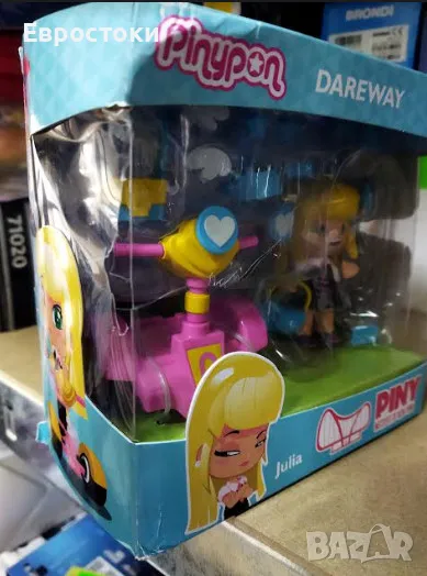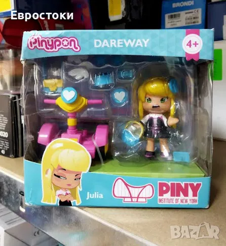 Включва кукла Pinypon Julia, нейния розов Dareway и аксесоари.