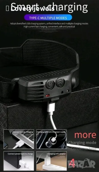 планината, работа „направи си сам“ и ремонт на уреди, автомобили и др. Режимът на светкавица може да бъде полезен при спешни случаи. То предлага гъвкавост чрез избора на до 10 светлинни режима с различни цветови температури, интензитети и функции, включително студена, топла, червена светлина и мигаща светлина. Има индукционен сензор за удобно включване и изключване, който позволява автоматично управление на светлината без натискане на бутони. Този фенер е не само универсален, подходящ за разнообразни дейности, но и удобен за употреба. С включения USB-C кабел за зареждане и акумулаторната си функция, той предоставя гъвкавост и удобство, докато еластичният и неплъзгащ се дизайн гарантира здраво задържане и адаптиране към формата на главата. Тази многофункционална фенерче е практичен аксесоар за различни ситуации, предлагайки и удобство, и сигурност в случаи на спешни нужди.