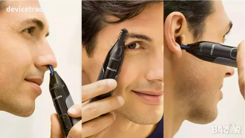 Лесно достигайте и премахвайте нежеланото окосмяване в носа и ушите. Уверете се, че ноздрите са чисти преди употреба и внимателно поставете тримера вътре в носа си на не повече от 0,5 см и бавно го въртете. Когато подстригвате косъмчета в ушите, уверете се, че ушите са без ушна кал. За веждите прикрепете с плъзгане един от двата гребена (3 и 5 мм) в процепите и подрежете с лек натиск и движение срещу посоката на растежа на косъма за равномерно подстригване на веждите до желаната дължина.