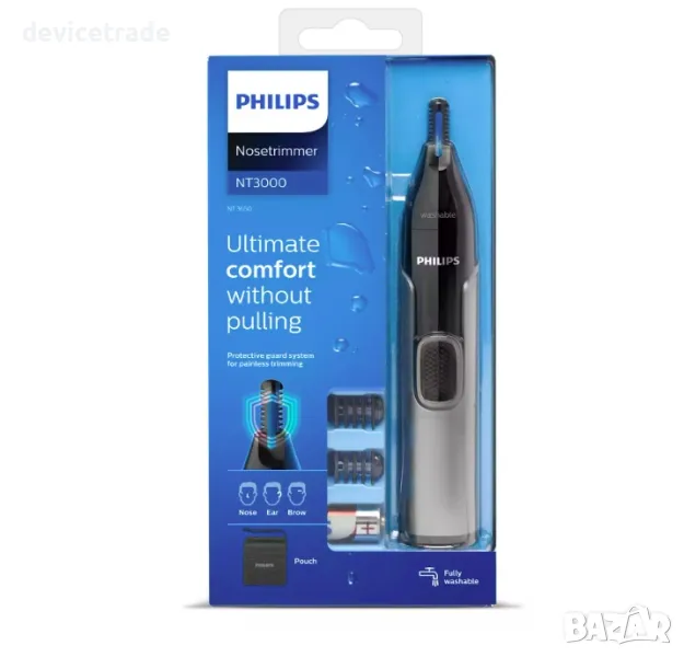 Машинка за подстригване на нос, уши и вежди, проектирана за безопасност и комфорт. Системата Protective Guard покрива ножчетата, за да гарантира, че те нямат директен контакт с кожата. Освен това е направена така, че да сведе до минимум пропуснатите косъмчета, дърпането или скубането.