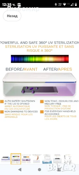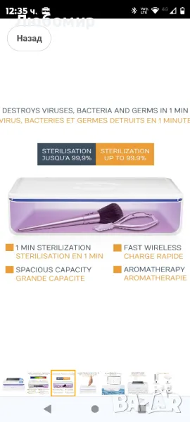 Бърза и безопасна стерилизация: 360° стерилизация, сертифицирана от лабораторията без производство на озон. По-ефективен от живачна лампа, UVC преминава през всички страни на предметите, които трябва да бъдат дезинфекцирани чрез процес на отражение.Голям капацитет: С дълбочина от 4 см може да побере повече предмети от класическите кутии за UVC стерилизация. Вашите ежедневни предмети (телефон, инструменти за маникюр...) се стерилизират с едно движение.Бързо безжично зарядно устройство: Оборудвано с най-новата система за бързо безжично зареждане. Той е съвместим с повечето устройства като вашите телефони, часовници, слушалки