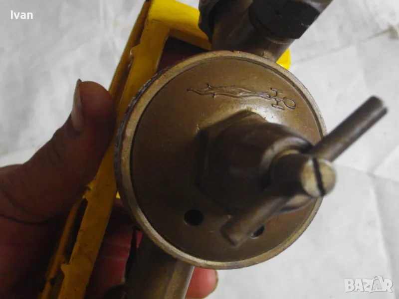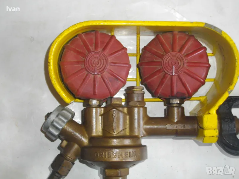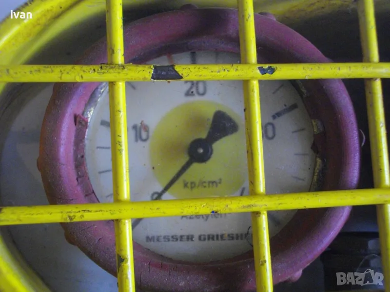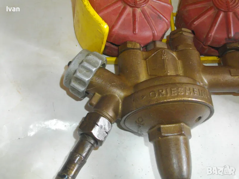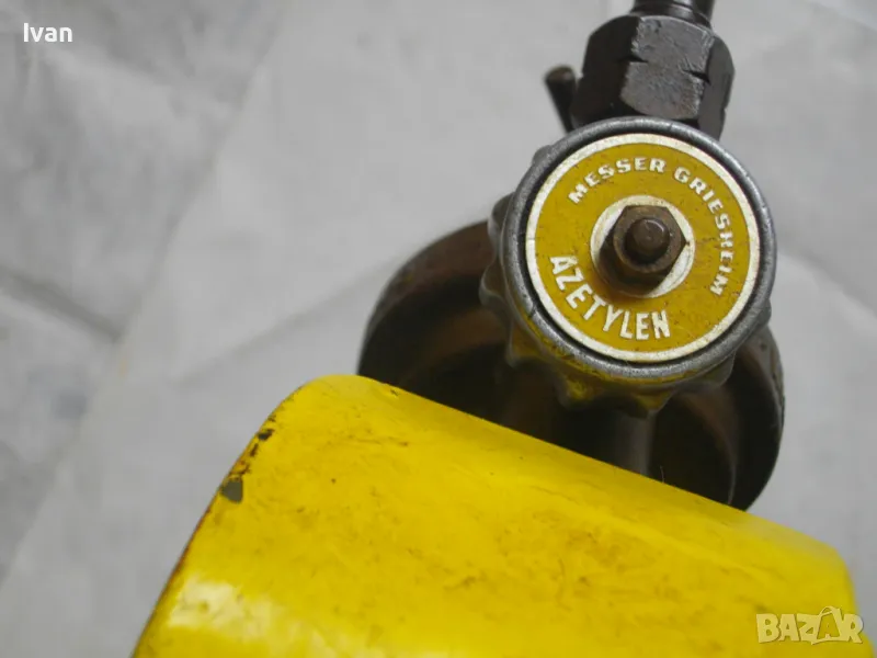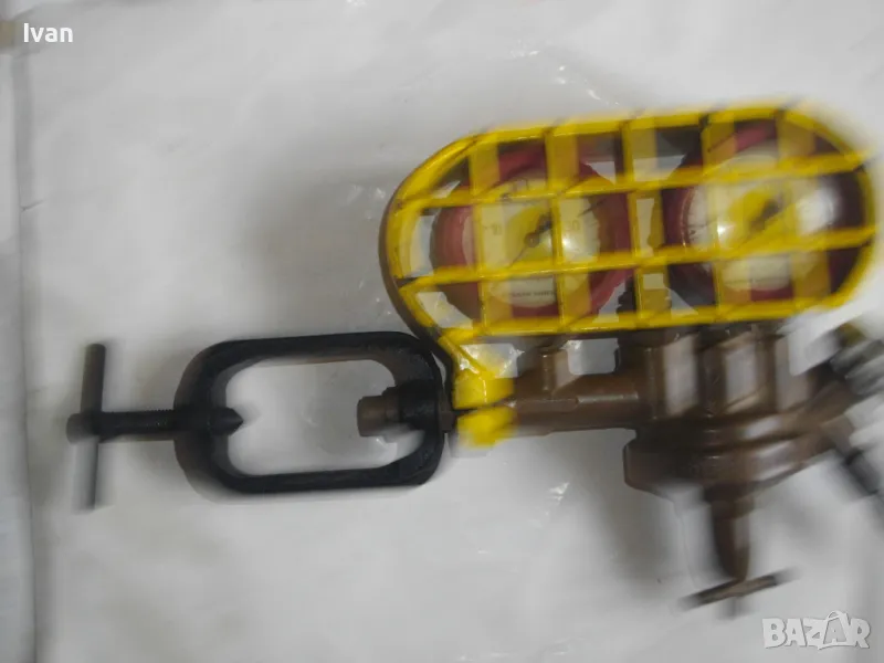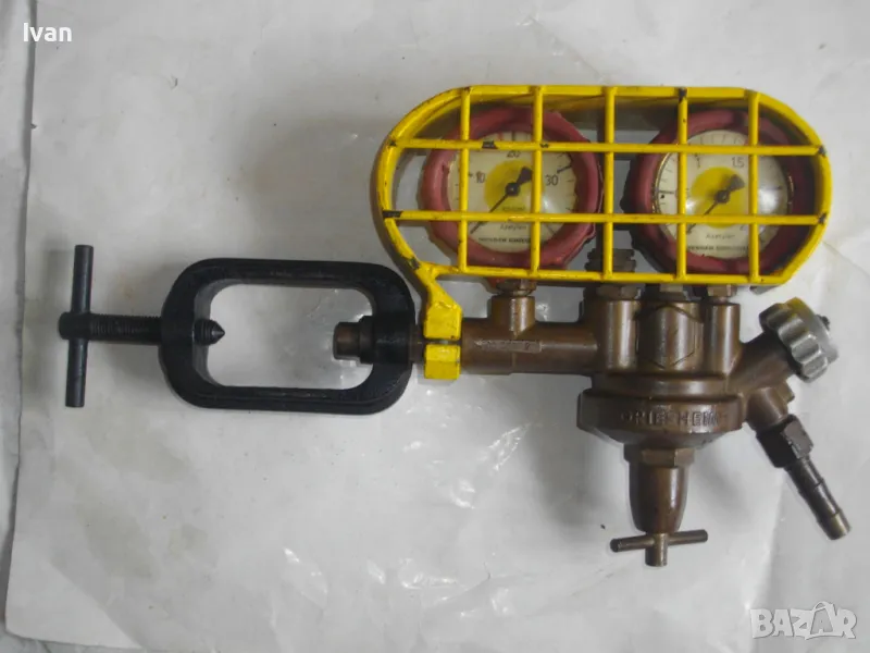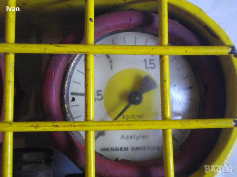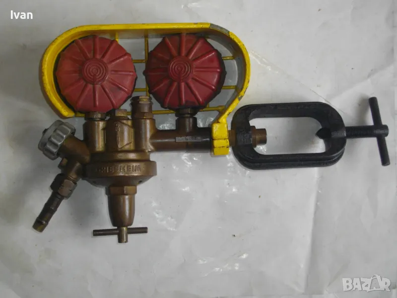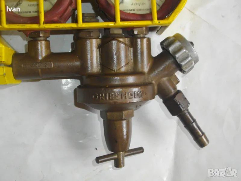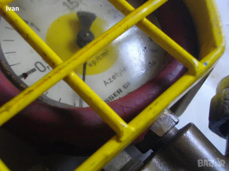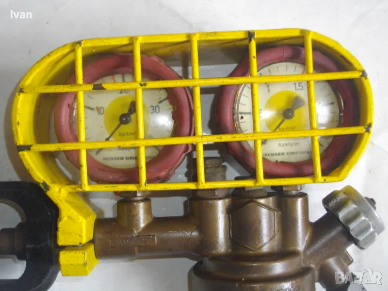 ОПИСАНИЕ на масивен редуцир вентил/клапан регулация налягане за оксиженна горелка/резак за ацетилен, с метална предпазна решетка - 179 лв. Професионален. Марка и модел - MESSER GRIESHEIM. 2 манометъра, над тях метална защитна предпазна решетка. Единият манометър е 0-40 бара, другия 0-2,5 бара. Маномеетрите отзад са с гумирано предпазно покритие. Глава на вентила - бронзова изцяло, масивна. Щуцер адаптер присъединителен към маркуч бронзов. Алууминиев върток спирателен кран и бронзов долен спирателен кран. Стоманена скоба обтегач. Размери на вентила : 330 х 210 х 90 мм. Тегло на вентила - 3,0 кг.