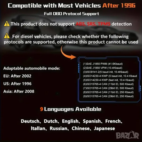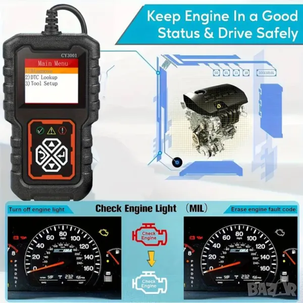 Устройството CY3001 е идеалният избор за всеки шофьор или механик, който иска бързо и лесно да диагностицира автомобилни проблеми. Основните му функции включват: