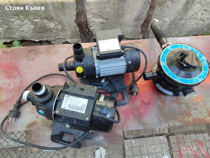 Помпи за басейн шест степенен кран работи без грешка има и пясък за филтъра.Напорна помпа.За повече информация по телефона.Филтрационна помпа ,Работи отлично.Филтърна помпа за басейн нова 70 лв..Потапяща помпа за фонтан или шадраван.За повече информация по телефона.