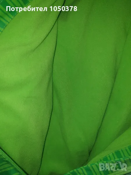 Зелено яке за дъжд, водоустойчиво/непромокаемо, тип парка. Якето е с поларена топла подплата, подходящо и за по-хладно време. Със светлоотразителни елементи на джобовете отпред. Започване с цип и с предпазител в горната част. С велкро лепенки на ръкавите за регулиране на ширината. Размерът е 110-116см, уголемено е. Може да се носи и от съседните номера.