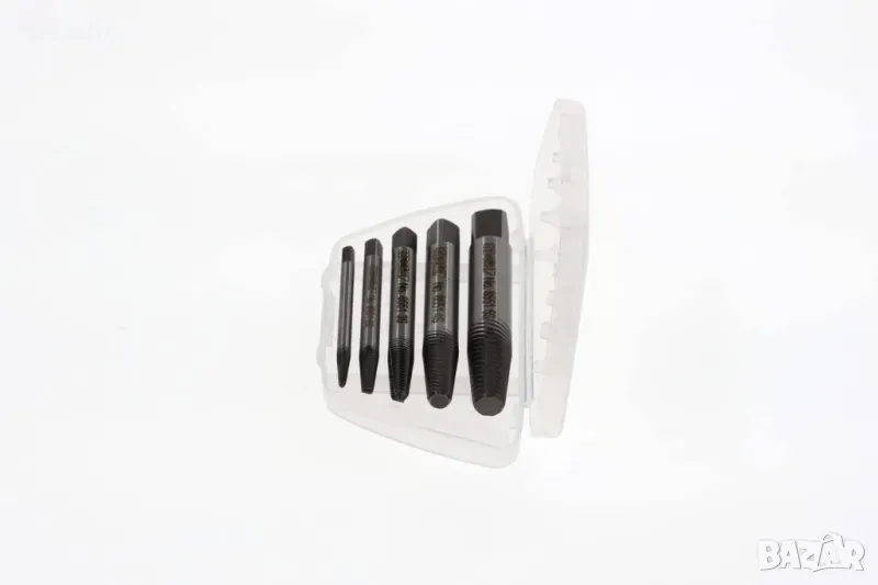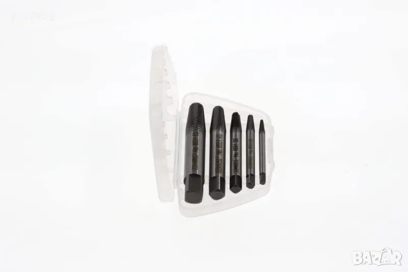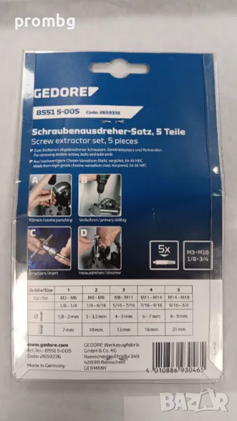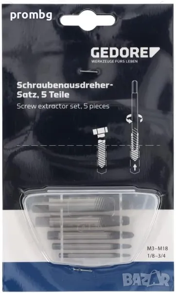 екстрактори 5 ч. Gedore M3-M18, 1/8 - 3/4 - Германия. За отстраняване на счупени винтове. Материал: висококачествена хром-ванадиева стомана - 54-56 HRC. Комплектът включва и пластмасова кутия за безопасно съхранение.