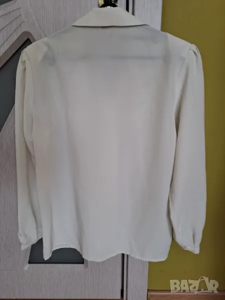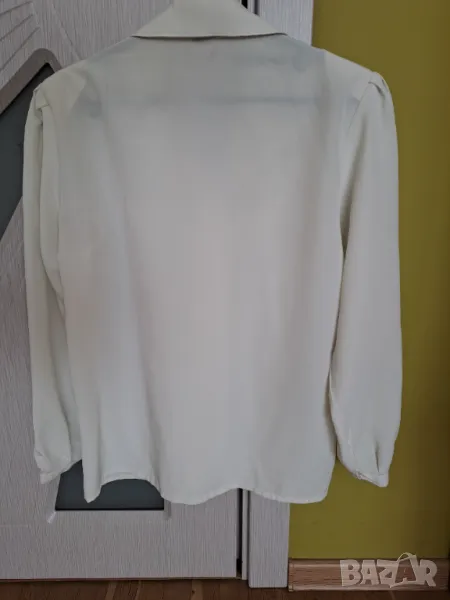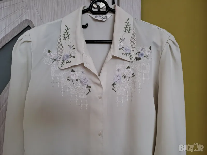 Дамска риза с цвят бял слонова кост с бродерия отпред и на яката. Размер М-L, бюст отпред - 48 см /или обиколка 96 см/, дължина 60 см, ръкав 57 см. Отговарям на съобщения тук, изпращам с куриер с отстъпка, преглед и тест, или лично предаване в София.