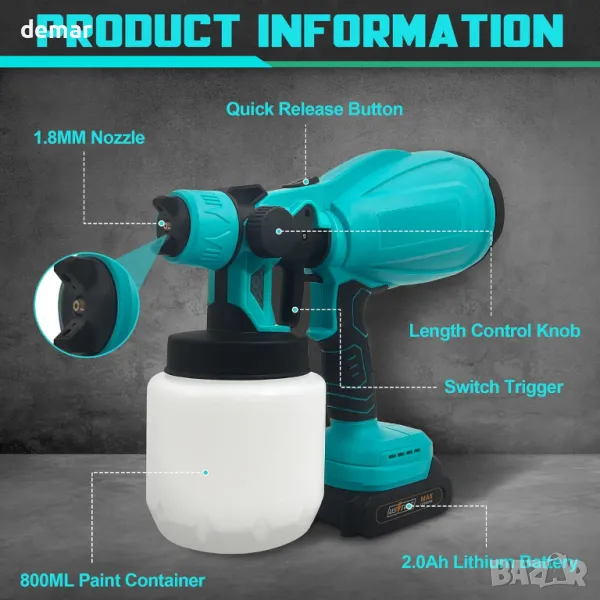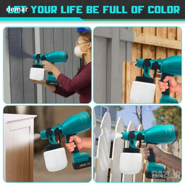 Пръскачката за боя Byczone разполага с мощен 600 W двигател от чиста мед и HVLP технология за ефективно, екологично пръскане, което спестява боя и време. Той предлага три регулируеми модела на пръскане (кръгов, хоризонтален, вертикален) и прецизен контрол на потока за различни повърхности като огради, стени, врати и мебели. Пръскачката е лесна за използване и почистване, с включени разглобяеми части и инструменти за почистване. Предлага се с две батерии от 2000 mAh за работа без кабел, предлагайки свобода от захранващи кабели и съвместимост с батерии Makita 18V. Пакетът включва пръскачка, контейнер от 1000 ml, батерии, чаша за вискозитет, инструменти за почистване и ръководство за употреба.