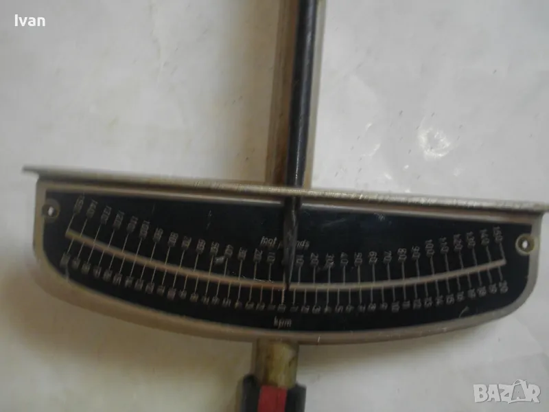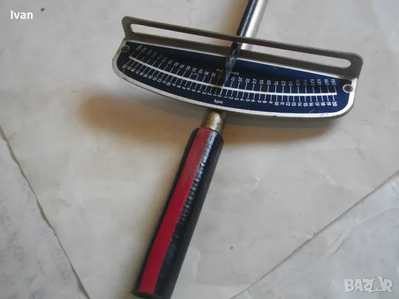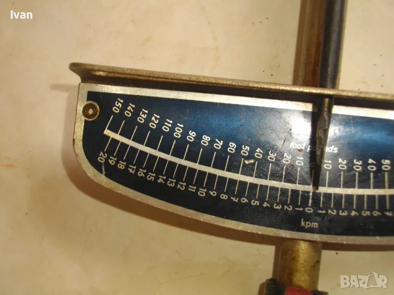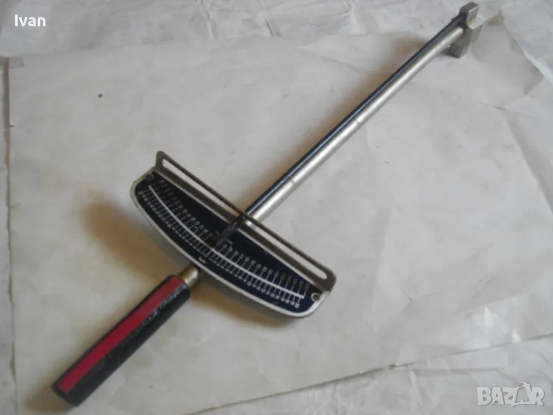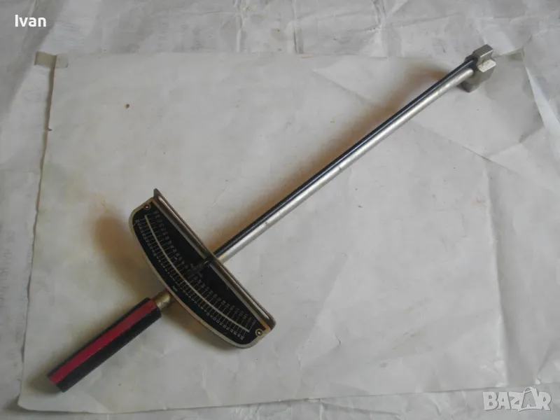 ОПИСАНИЕ на динамометричен ключ..Тип стрелкови, със скала. Сила натягане - 0-150 Nm, 0-150 foot pound, 0-20 kpm. Запазен външен вид на инструмента, скалата няма никакво захабяване. Стрелката пада точно върху нулата - ключа е съвсем точен. Глава - стоманена, за стандаретне накрайник размер 13 мм, със съчма на главата е квадрата, която е в пълна изправност. Цялостна дължина на ключа - 450 мм. Дръжката е преправена - поставен е масивен гумен, нехлъзгащ се накрайник за дръжка.