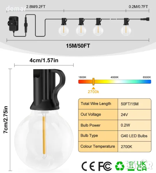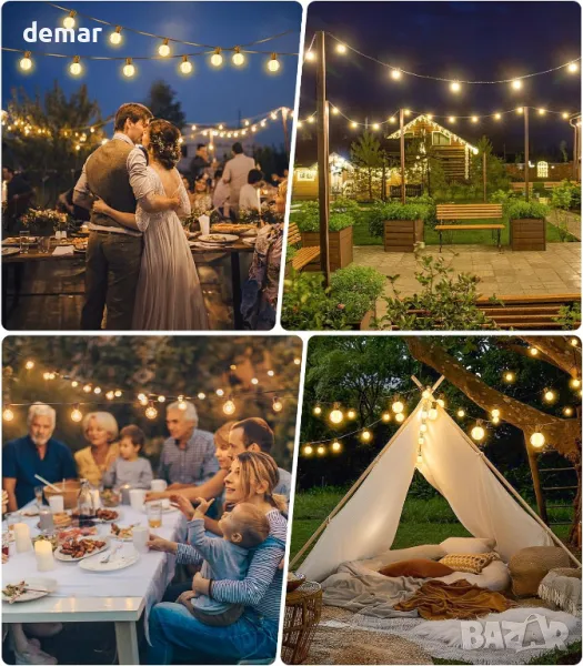Градинското осветление има обща дължина от 15 м и дължина на захранващия кабел от 3 м, което ви позволява да свържете няколко светлинни низа, което ви позволява да декорирате по-голямо пространство. Предлага се с 24+2 резервни крушки, излъчващи 2700K топла светлина, използвани за украса на сватби, партита, рождени дни, барбекюта, Коледа, годишнини, създавайки романтична и приятна атмосфера. Първият избор за къмпинг и декорация на открито.