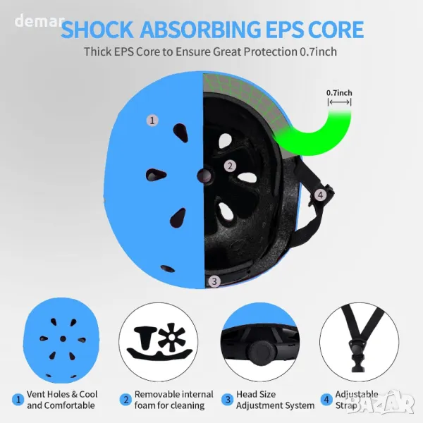 Този пълен детски предпазен комплект 7 в 1 осигурява цялостна защита с велосипедна каска и две подложки за коленете, лактите и китките, като гарантира, че детето ви е добре защитено по време на дейности като колоездене, кънки и ролери. Шлемът разполага с 11 вентилационни отвора за охлаждащ въздушен поток, а вътрешната му обвивка от дебела EPS пяна предлага отлично поглъщане на удара, докато здравият екстериор от ABS гарантира издръжливост. Регулируемата каишка за брадичката и въртящите се бутони на каската, заедно с еластичните ленти на подложките, позволяват адаптивно прилягане, осигурявайки комфорт и максимална защита. Идеален за различни спортове с голямо натоварване, този комплект съчетава безопасност и комфорт за безпроблемна игра.