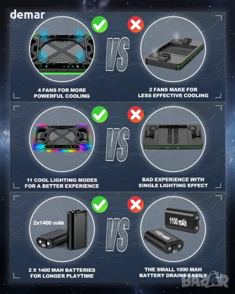 Този аксесоар "всичко в едно" Xbox Series X разполага с четири високоефективни охлаждащи вентилатора с регулируеми скорости за предотвратяване на прегряване, докинг станция с двойно зареждане с две 1400mAh батерии за едновременно зареждане на контролера и 11 RGB светлинни режима за персонализирана игрова атмосфера. Той също така включва стойка за слушалки, два слота за разширителни карти и съхранение за шест диска с игри, което помага да поддържате игралната си зона организирана и чиста. Докинг станцията за зареждане осигурява ясно състояние на зареждане с червени и зелени индикатори и поддържа само оригинални батерии на Xbox.