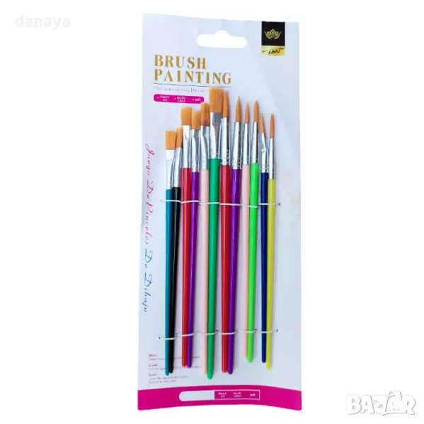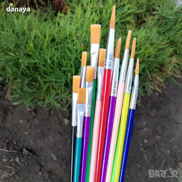 Смесен комплект четки за рисуване – обли и плоски. Косъмът на четките е с универсално приложение, достатъчно водоносен за акварел и други по-течни бои, гваш и различни тушове, и едновременно с това издръжлив на работа с по-гъстите маслени и акрилни бои.