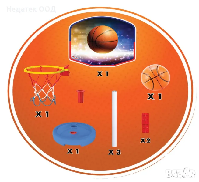Баскетболен кош с 25 см пластмасова основа, която можете да напълните с вода или пясък, за да я стабилизирате, 3 24 см тръби, които се свързват заедно, за да направят баскетболният кош толкова висок, колкото желаете, табло 43x33 см и 25 см ръб. Максималната височина на баскетболният кош (без таблото) е 126 см. Пакетът съдържа топка. Подходящ е за вътрешна и външна употреба.