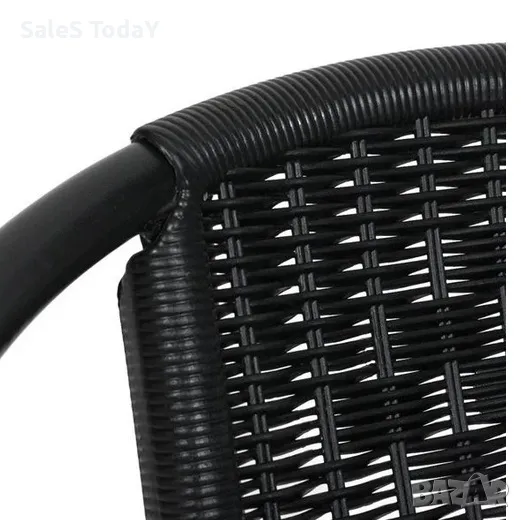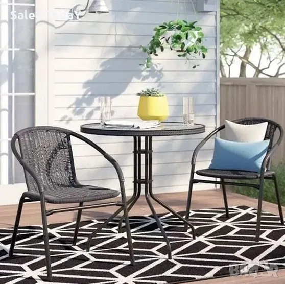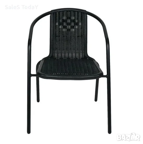 Стол, с метална конструкция и пластмасова седалка и облегалка с плетен дизайн- топ ратан. Може да се подрежда един върху друг за лесно съхранение.