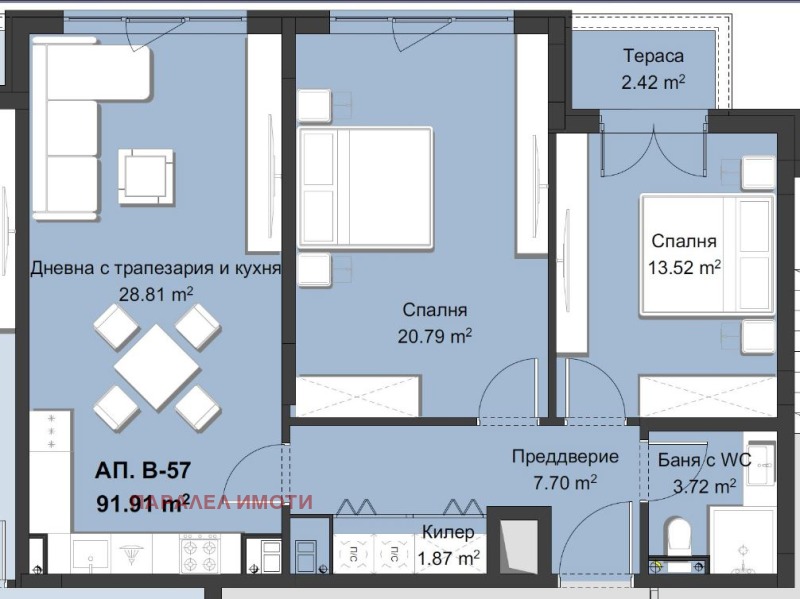 Жилището,което ви предлагам,се намира на ет.8 с изложение запад.Състои се от дневна с трапезария и кухня,две спални,предверие с килер,прилежаща изба и санитарен възел. Има излаз на тераса.