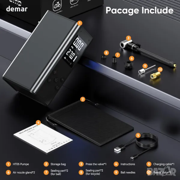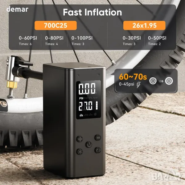 Тази компактна и лека мини помпа за велосипеди, тежаща само 160 g и с размери 3,6 x 5,1 x 8,7 сантиметра, предлага бързо надуване с максимално налягане от 100 PSI и скорост на пълнене до 20 L/min, достигайки 0- 60 PSI само за 60-70 секунди. Съвместим е както с клапани Presta, така и с Schrader, което го прави универсален за различни велосипеди. Акумулаторната батерия се зарежда напълно за 60 минути и може да напомпа ефективно множество гуми. Пакетът включва помпата, различни клапани, сферична игла, кабел за зареждане, уплътнителни части, уплътнение на въздушната дюза, преса за клапан, чанта за съхранение и инструкции.