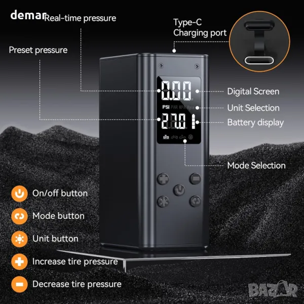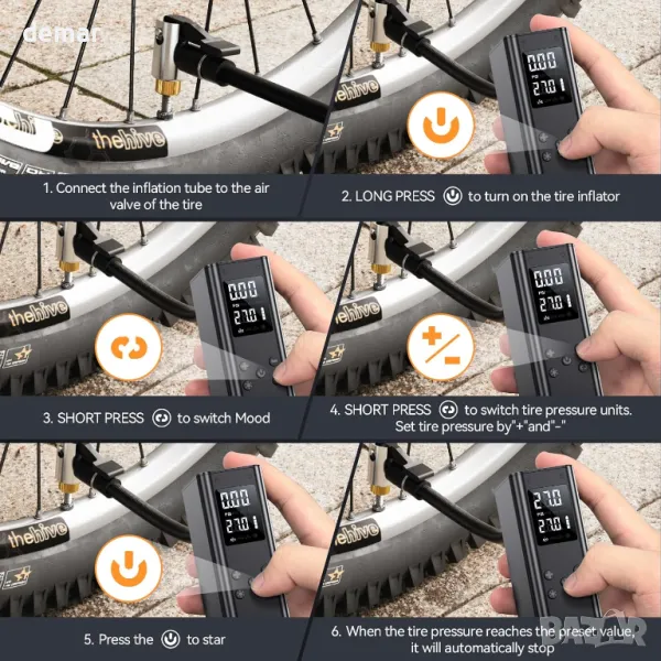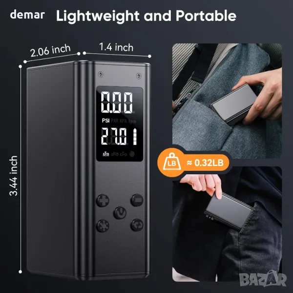 Мини електрическа помпа за велосипеди, с дигитален манометър, с аксесоари Presta, Schrader Valve
