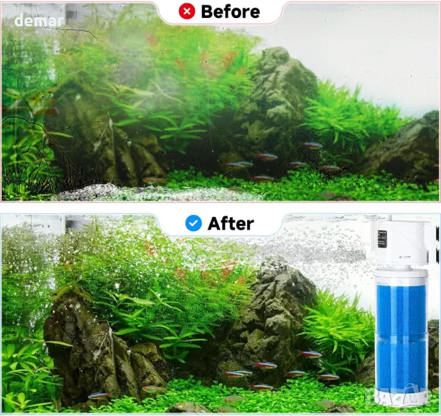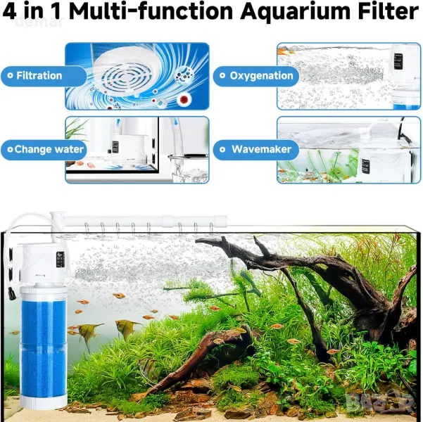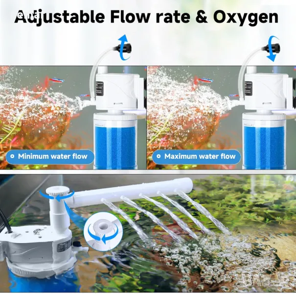 Този аквариумен филтър "всичко в едно" предлага ефективно абсорбиране на примесите, създавайки чиста и свежа среда за водните обитатели. Разполага с два режима: режим на аериране с регулируем въздушен поток за увеличаване на подаването на кислород и режим на дъжд за нежно разпределение на водата. Регулируем клапан за потока осигурява комфортна среда за малки риби и скариди. Ултра-тихият мотор и дизайнът на вътрешната помпа минимизират шума, докато големият филтърен патрон позволява персонализирано филтриране. Подходящ както за солена, така и за сладка вода, той е лесен за използване, почиства се и е идеален за различни аквариуми и хидропонни съоръжения.