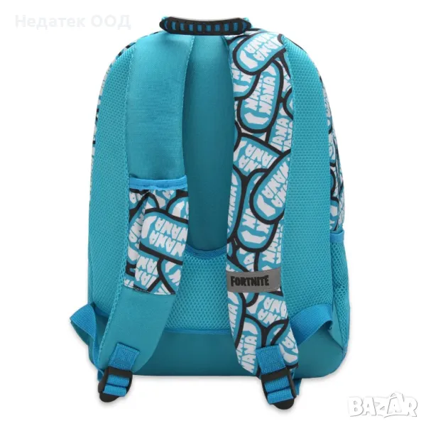 Ученическа раница, тюркоазена с дизайн Fortnite, с едно голямо отделение, 2 отделения с цип и странични мрежести джобове. Има издръжливи ципове, мек гръб и регулируеми презрамки.