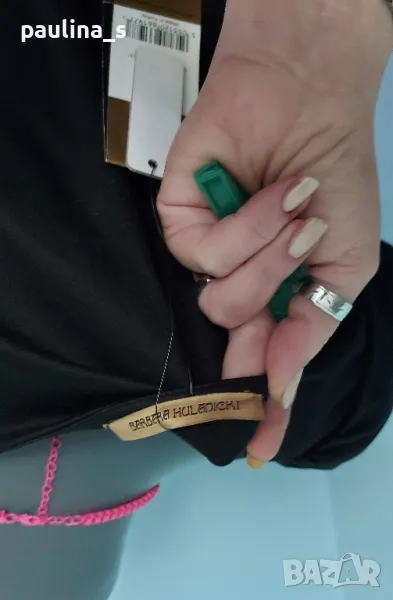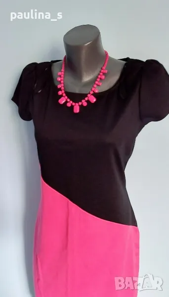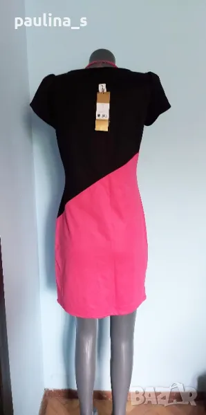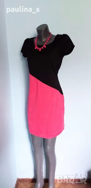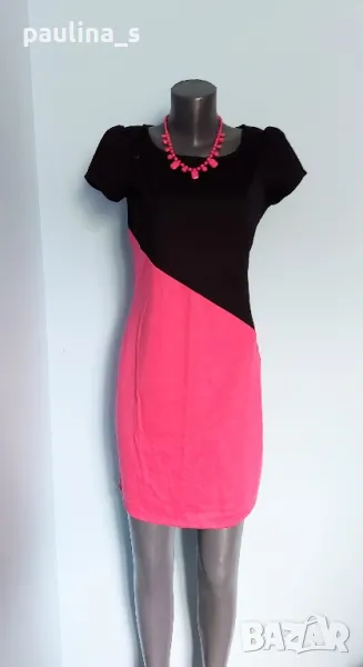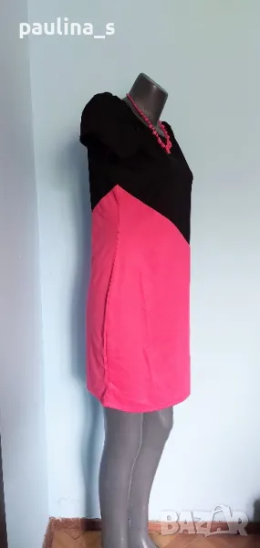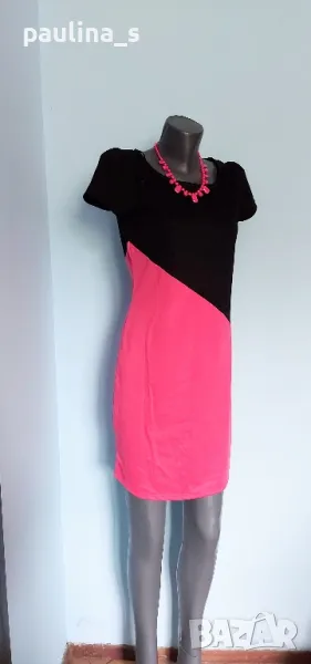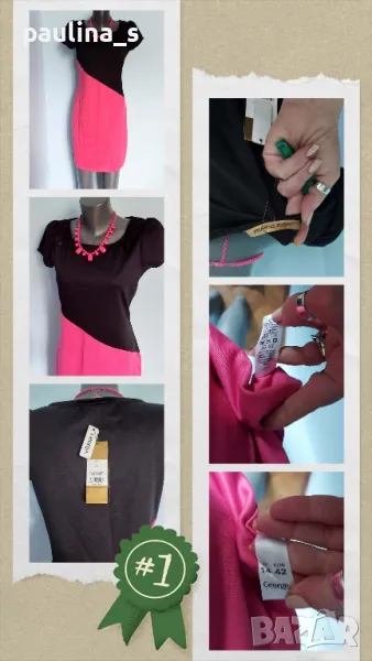 2️⃣. Колаж / L / XL "Barbara Hulanicki by George". Цената е крайна 29,99лв / 15 евро. Двуцветна дизайнерска рокля. Материята е немачкаема с умерена еластичност полиестер, полиамид и еластан. Моделът е втален, а ръкавите са почти загатнати, като крила, оформящ ефект за силуета на горната част. Купена е на разпродажба в Лондон, цената на етикета в лири.